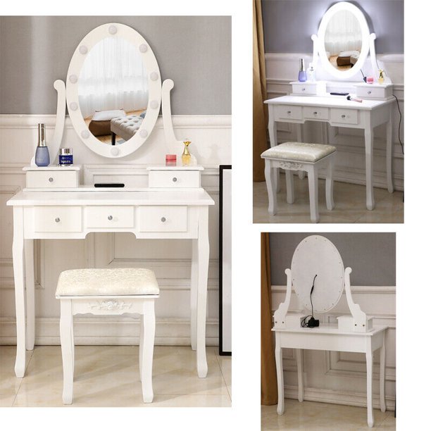 Hollywood / vanity makeup dressing table wooden cosmetic table stool set with light & mirror. 4.5 out of 5 stars. 5% voucher applied at checkout. Dressing table stool 3 mirror jewellery cabinet 7 drawer makeup. Vanity table set with lighted mirror, makeup dressing table and cushioned stool set with 5 large drawers for women girls (black) 4.6 out of 5 stars 473.